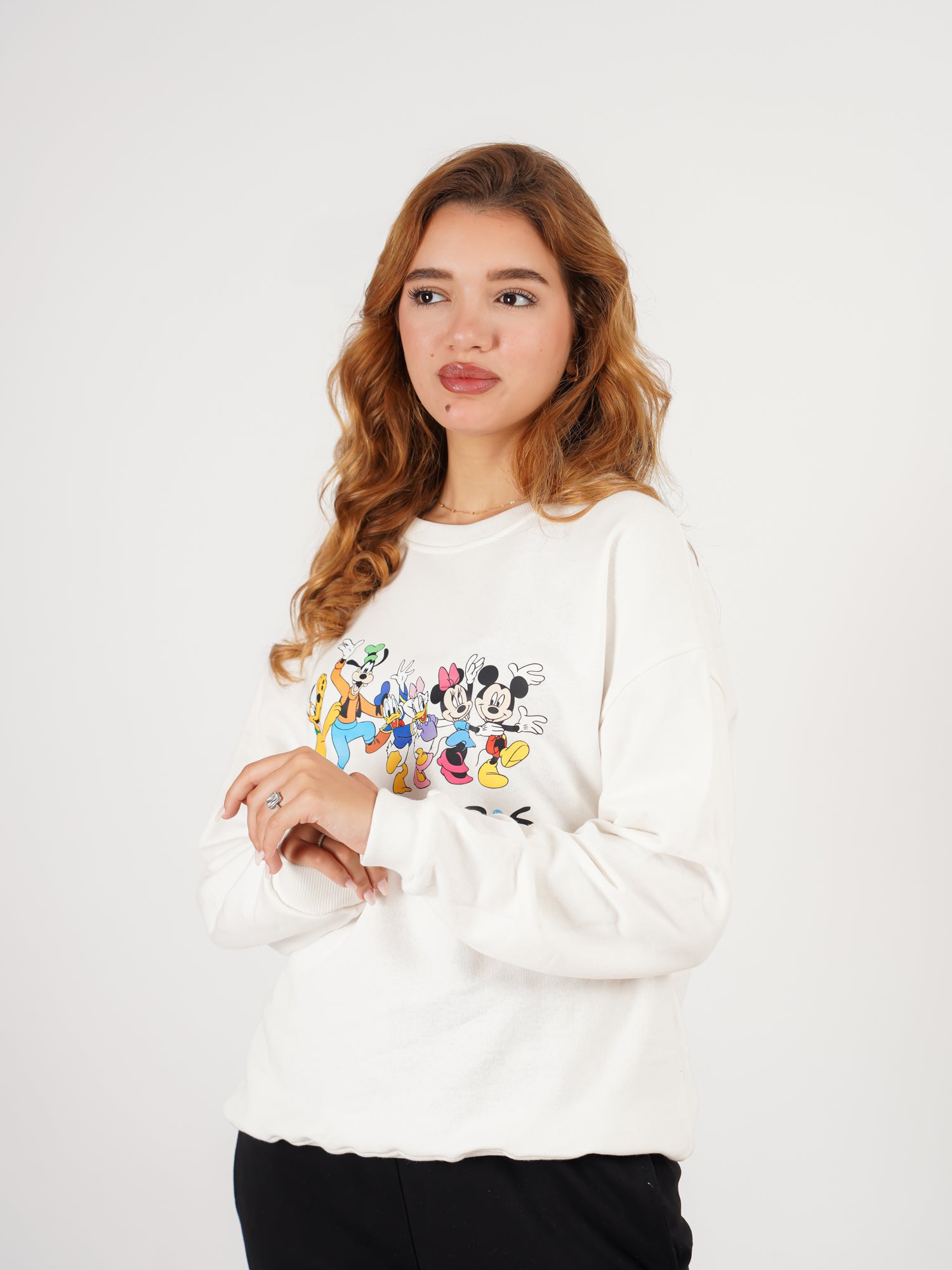 Le sweat blanc, en molleton de qualité premium, présente une coupe oversize et un col rond. L’avant est décoré d’un imprimé coloré “Friends” mettant en scène Mickey, Minnie, Dingo et leurs amis.
