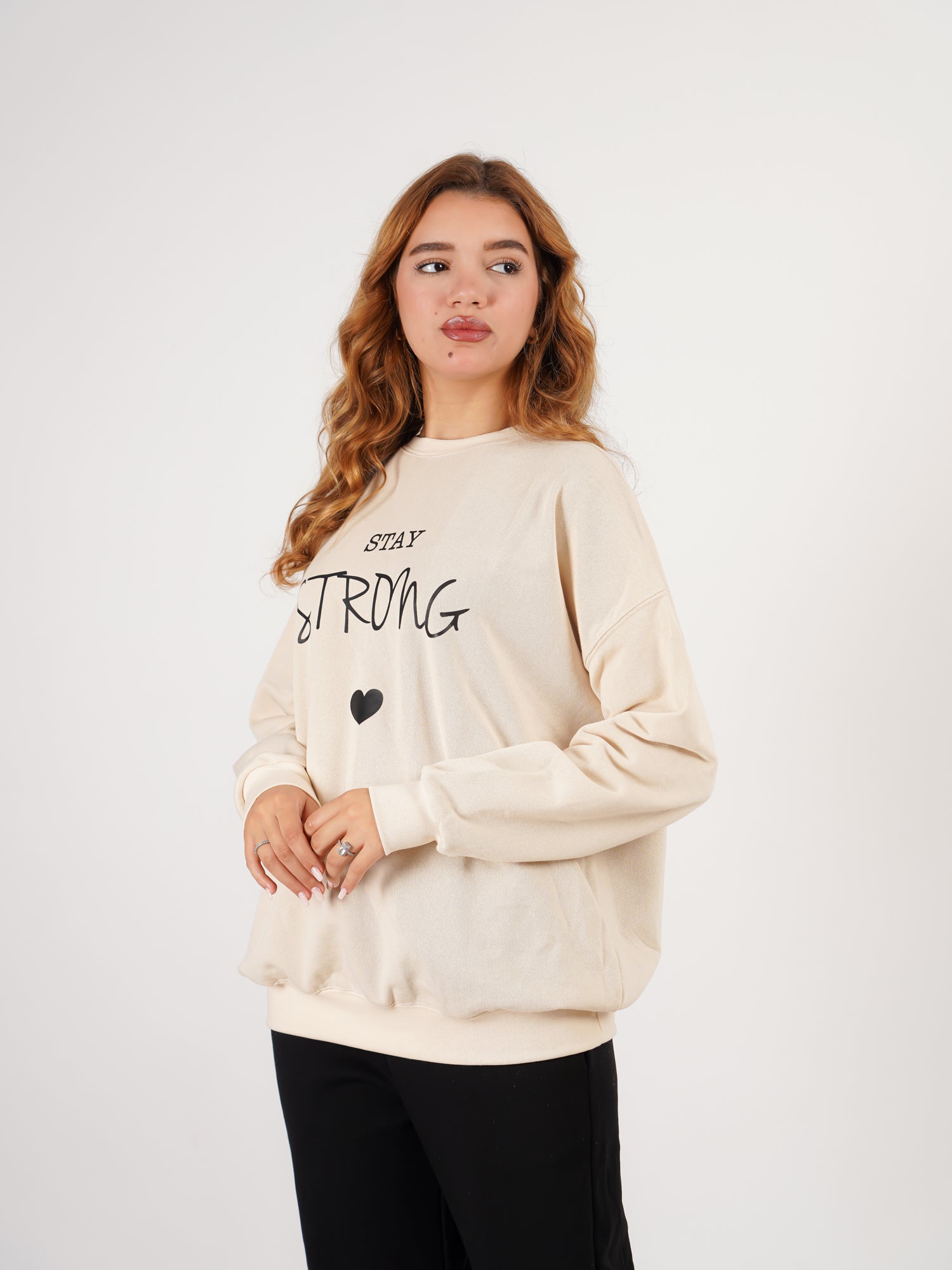 Sur la poitrine, une inscription “Stay Strong” accompagnée d’un petit cœur noir souligne un style à la fois doux et motivant.