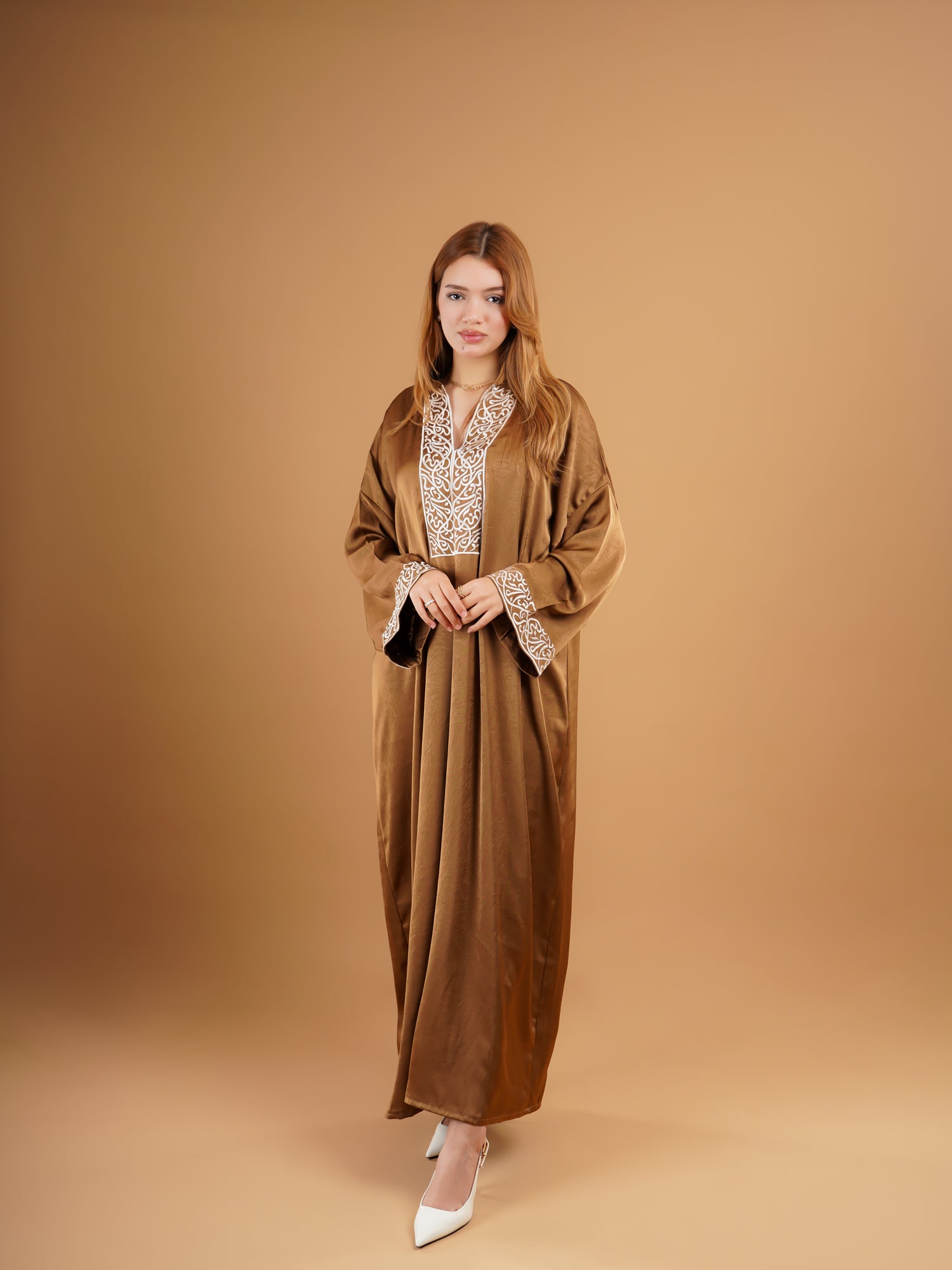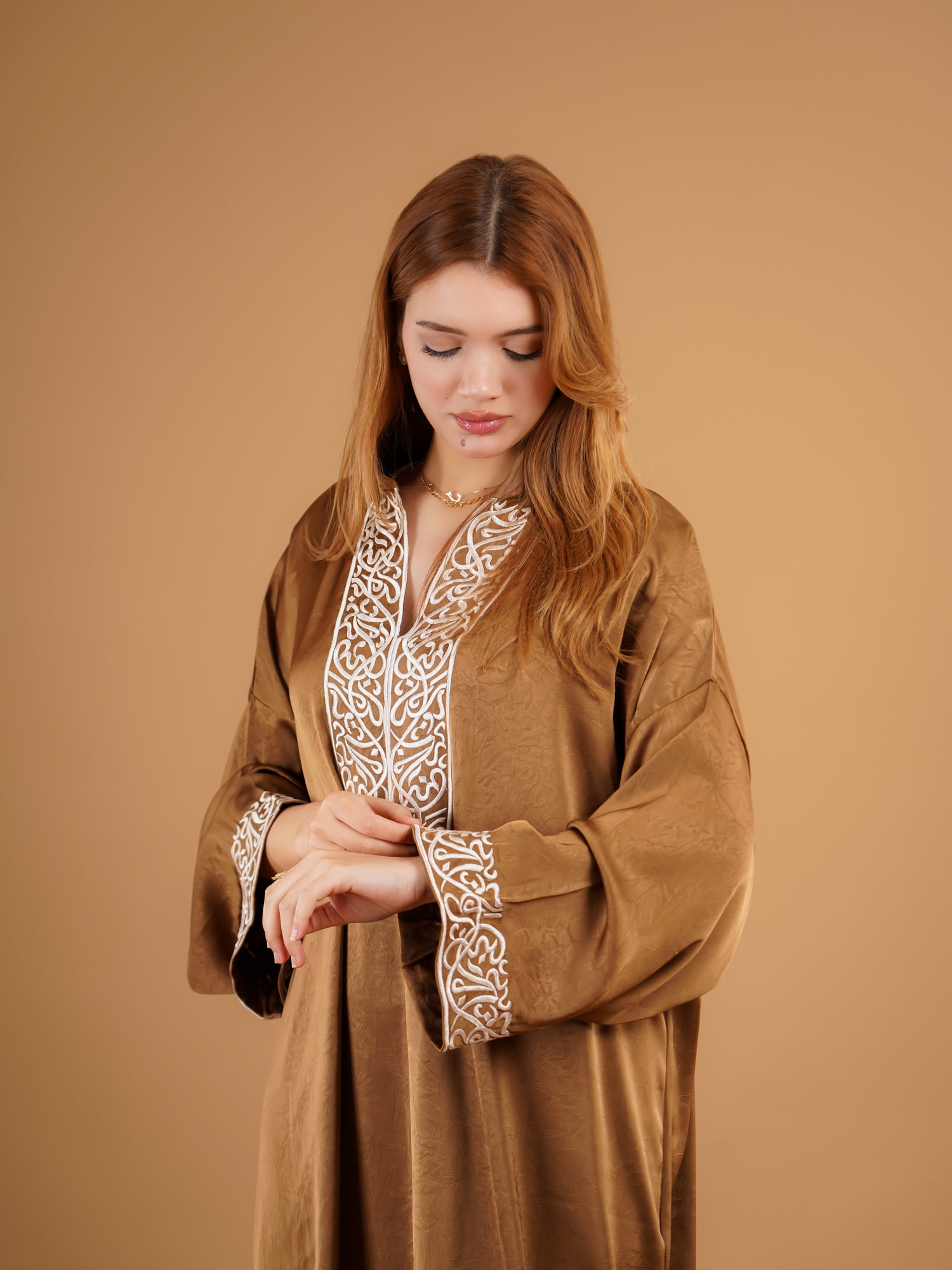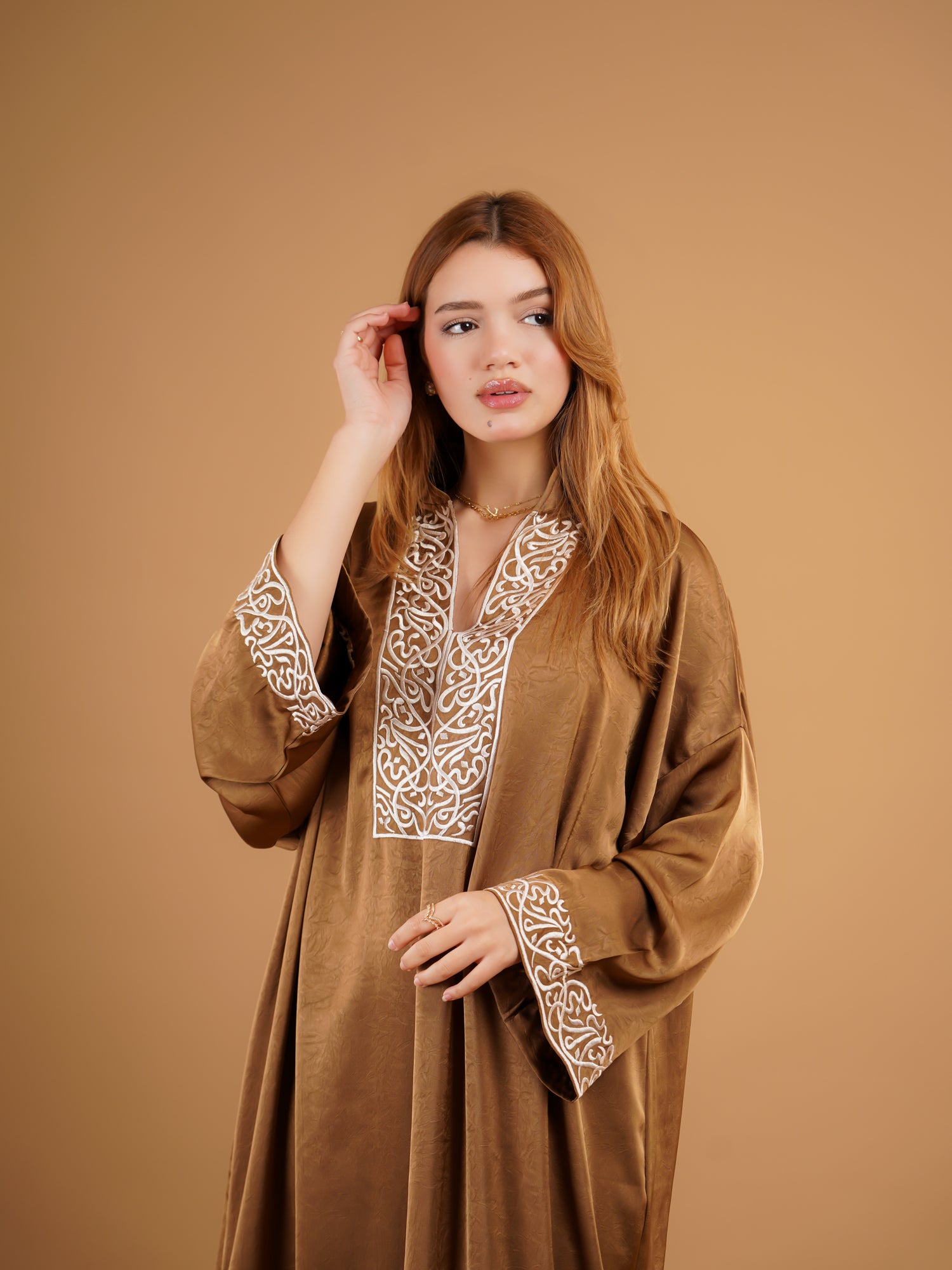 Chaleureuse et lumineuse, cette gandoura en drap de soie diamant enveloppe la silhouette d’une élégance naturelle. Son tissu fluide, doux au toucher et agréable à porter, offre un rendu satiné qui apporte immédiatement une note haut de gamme à la tenue. La coupe ample laisse au corps toute sa liberté, créant une sensation de confort et de légèreté très appréciable au quotidien comme lors des belles occasions. Sa teinte bronze lui donne une présence raffinée, tandis que la broderie claire structure délicatement le devant et les poignets. Une pièce chic et polyvalente, pensée pour vous faire sentir belle, à l’aise et parfaitement mise.