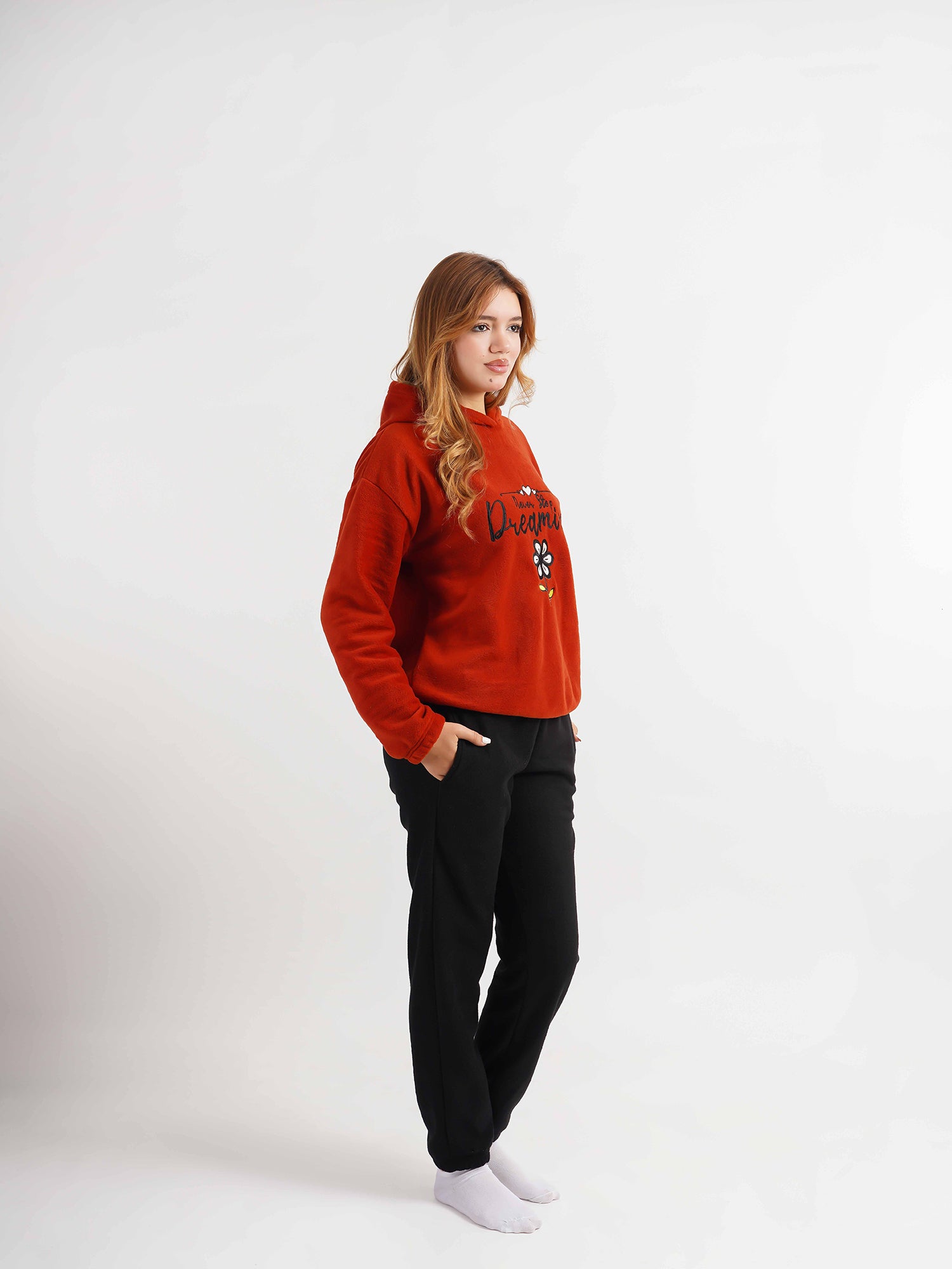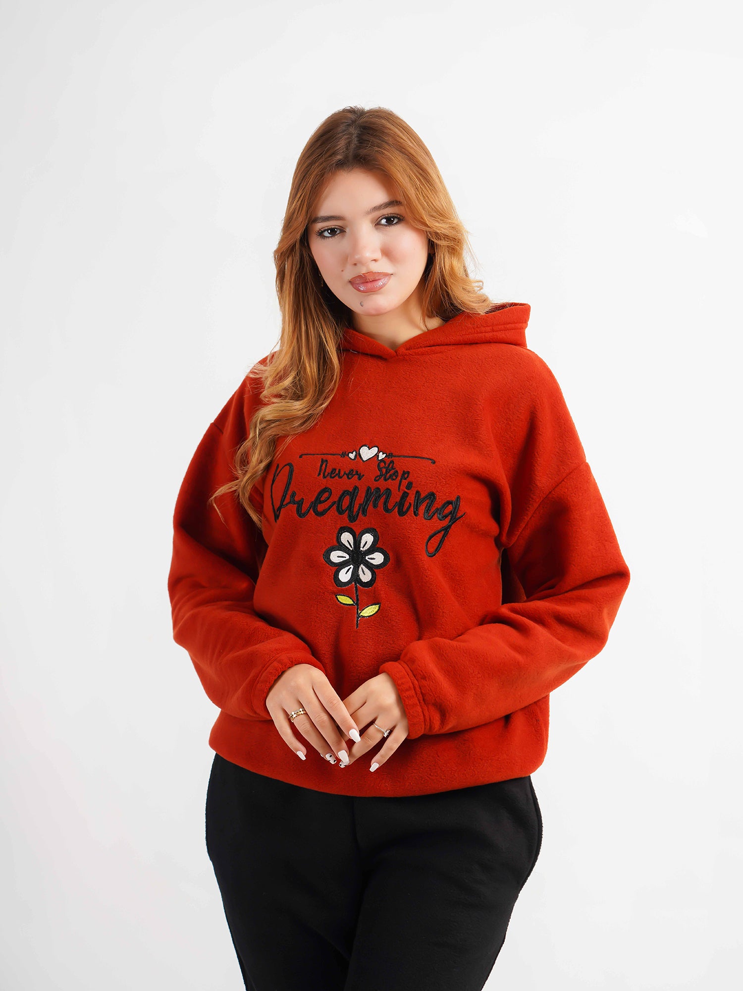 ✔️ Sweat-shirt à capuche rouge brique avec broderie « Never Stop Dreaming » et motif floral
